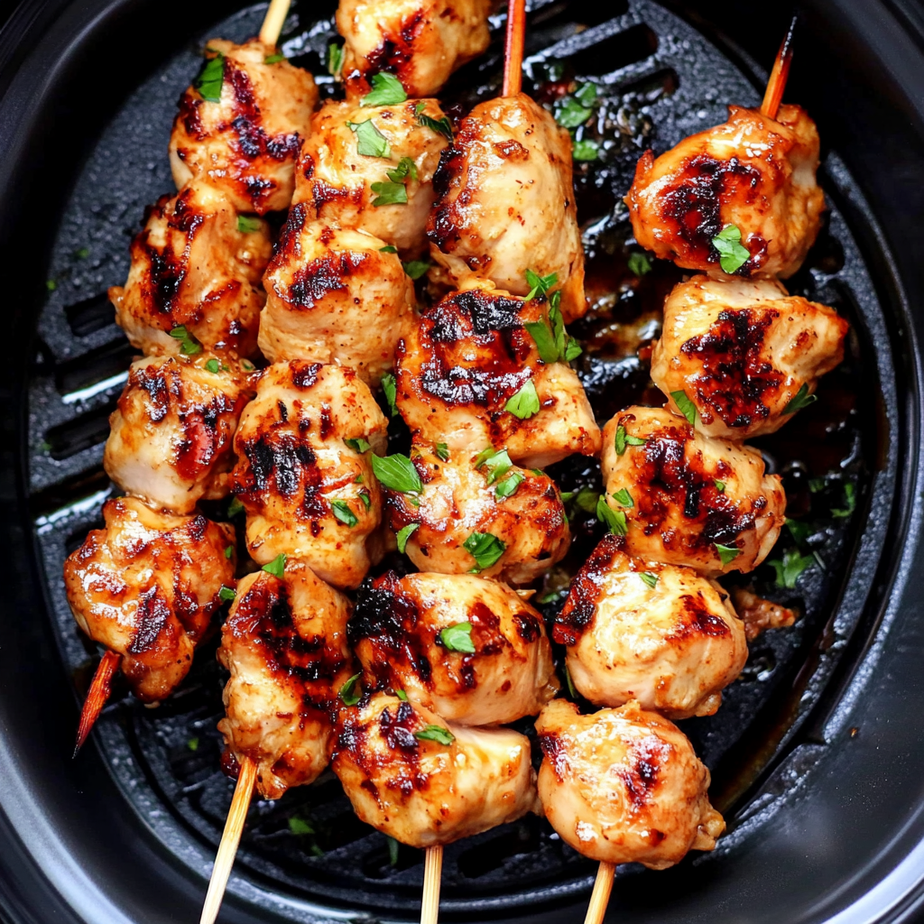Air fry those delicious skewers for about 12-15 minutes. Flip them halfway through cooking so they brown beautifully on all sides. The chicken should reach an internal temperature of 165°F (74°C) when fully cooked.