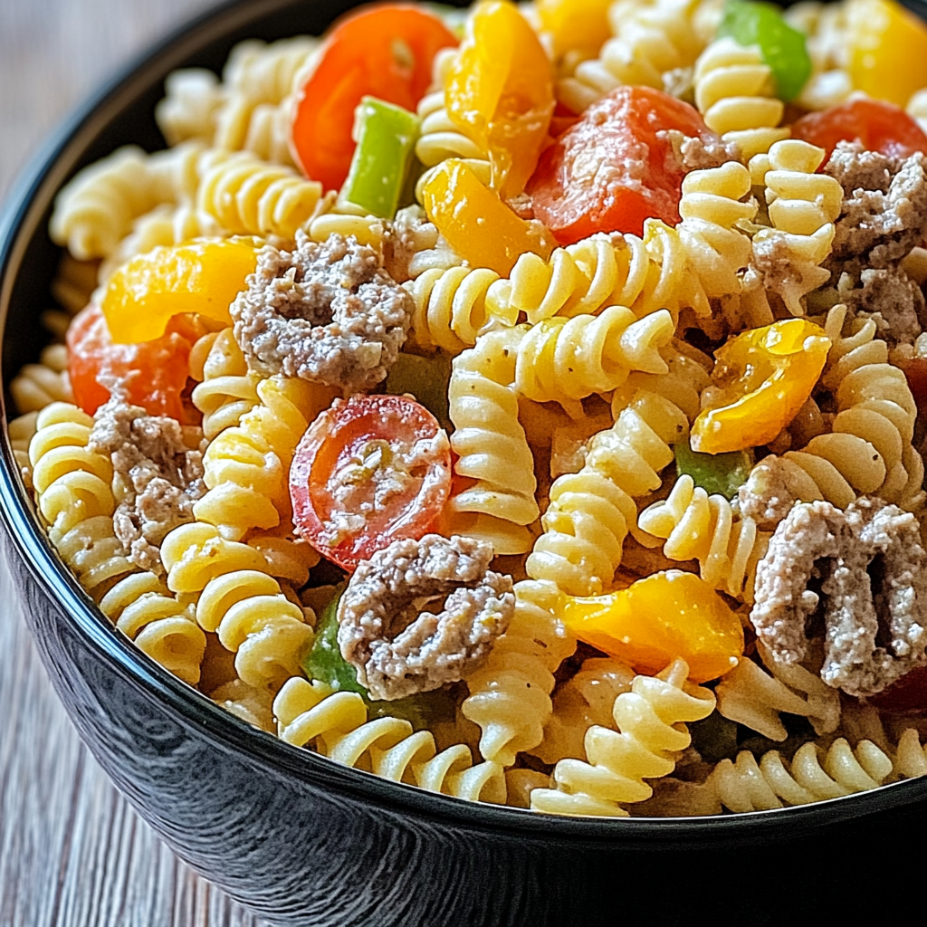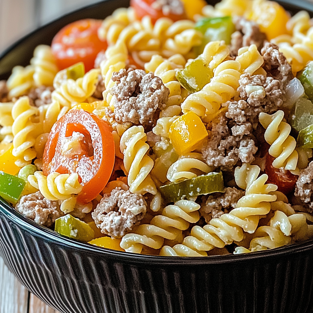 - In a large mixing bowl, combine cooled pasta with ground beef, grape tomatoes, diced pickles, shredded cheese, and red onion. Add dressing and toss gently to coat.