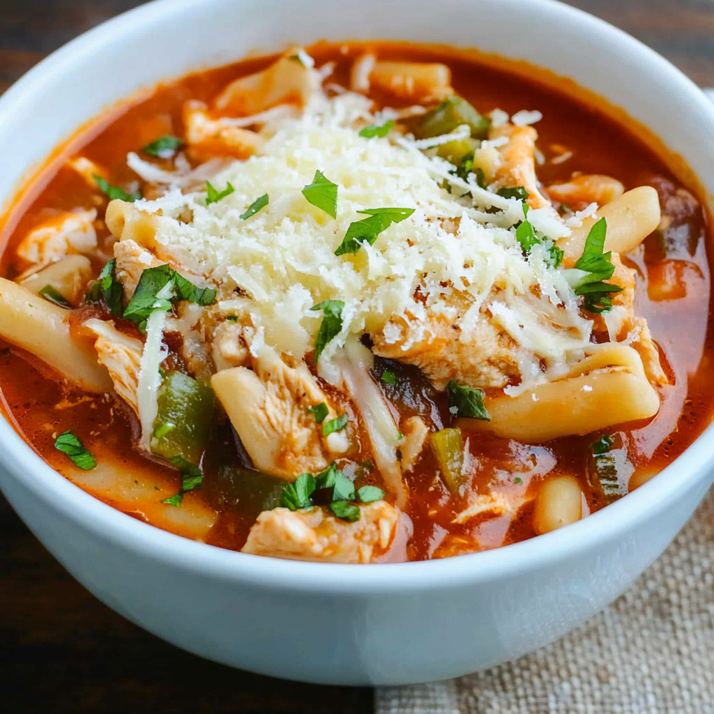 Enjoy every warm spoonful of this delightful Chicken Parmesan Soup!