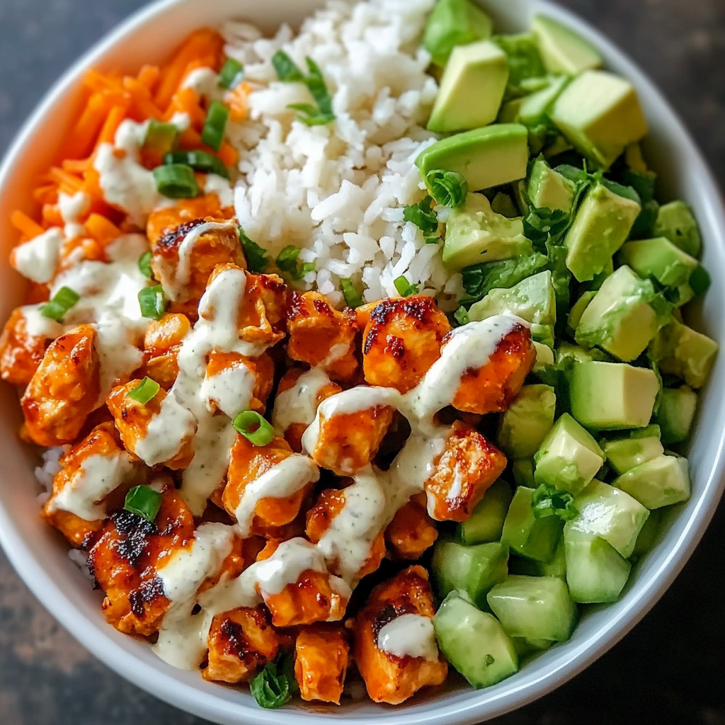 - Assemble bowls by layering the base with buffalo chicken and fresh veggies like avocado, carrots, and tomatoes.