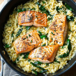 If you’re searching for a quick, flavorful meal that’s sure to impress, look no further than this One Skillet Salmon with Lemon Orzo. This recipe is perfect for busy weeknights when you want a healthy yet satisfying dinner without the hassle of multiple pots and pans. The combination of tender pan-seared salmon paired with zesty lemon orzo and vibrant spinach creates a delightful balance of flavors. Plus, it takes just 30 minutes from start to finish! Whether you’re cooking for your family or hosting friends, this all-in-one dish brings everyone together for a delicious dining experience.