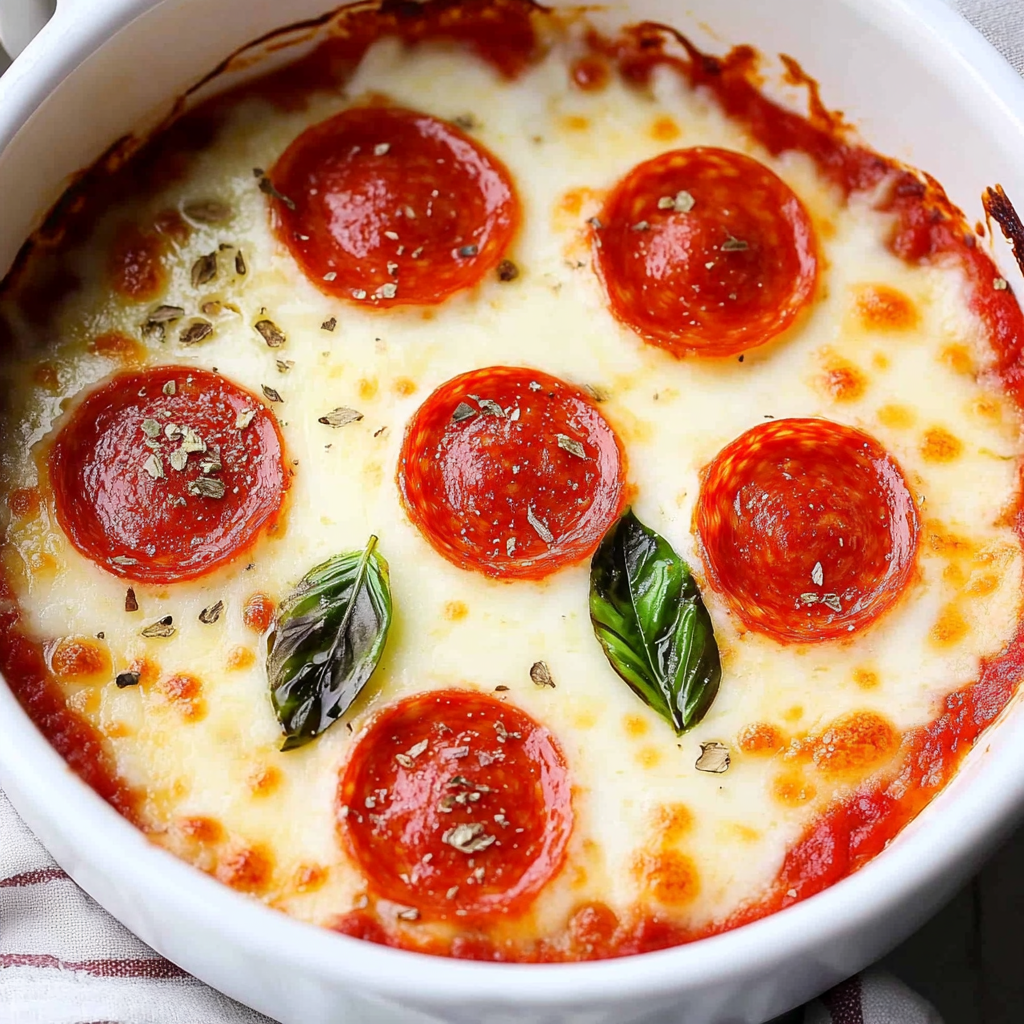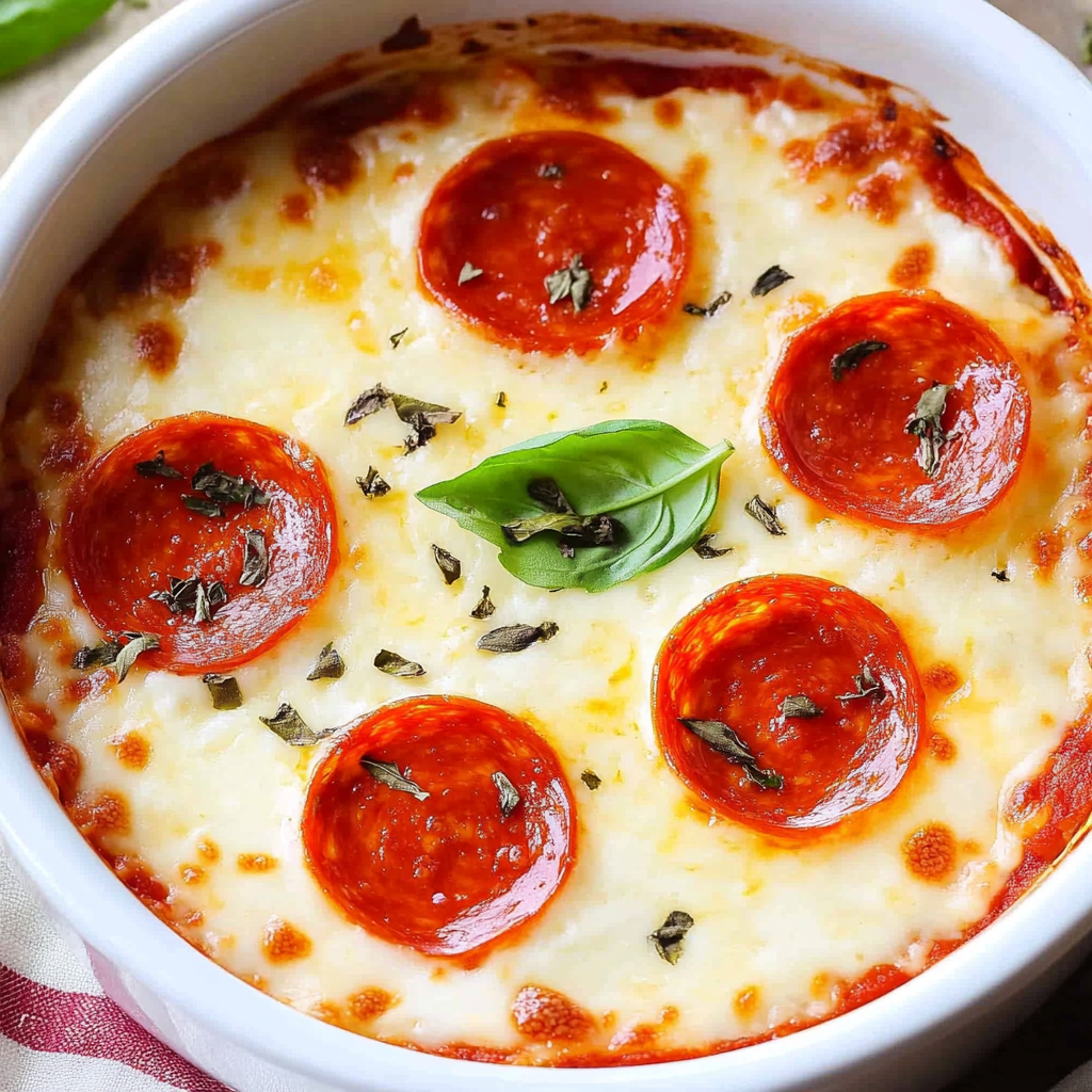 Pour the mixture into your prepared baking dish. Top it off with the remaining mini turkey pepperoni slices. This not only adds flavor but also gives your bake that classic pizza look we all love!