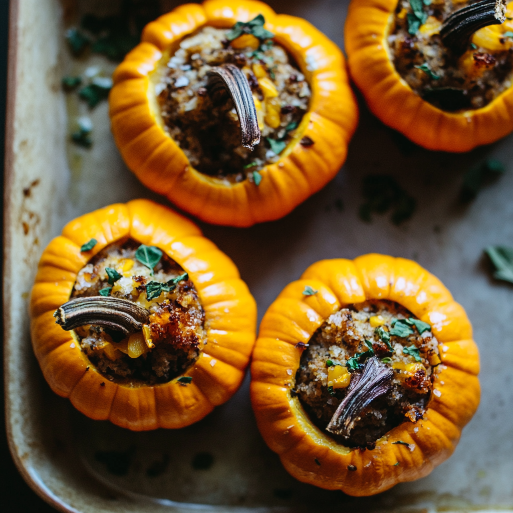 • Mixed green salad: A light salad with arugula, cherry tomatoes, and a lemon vinaigrette adds brightness and balances the richness of the stuffed pumpkins.